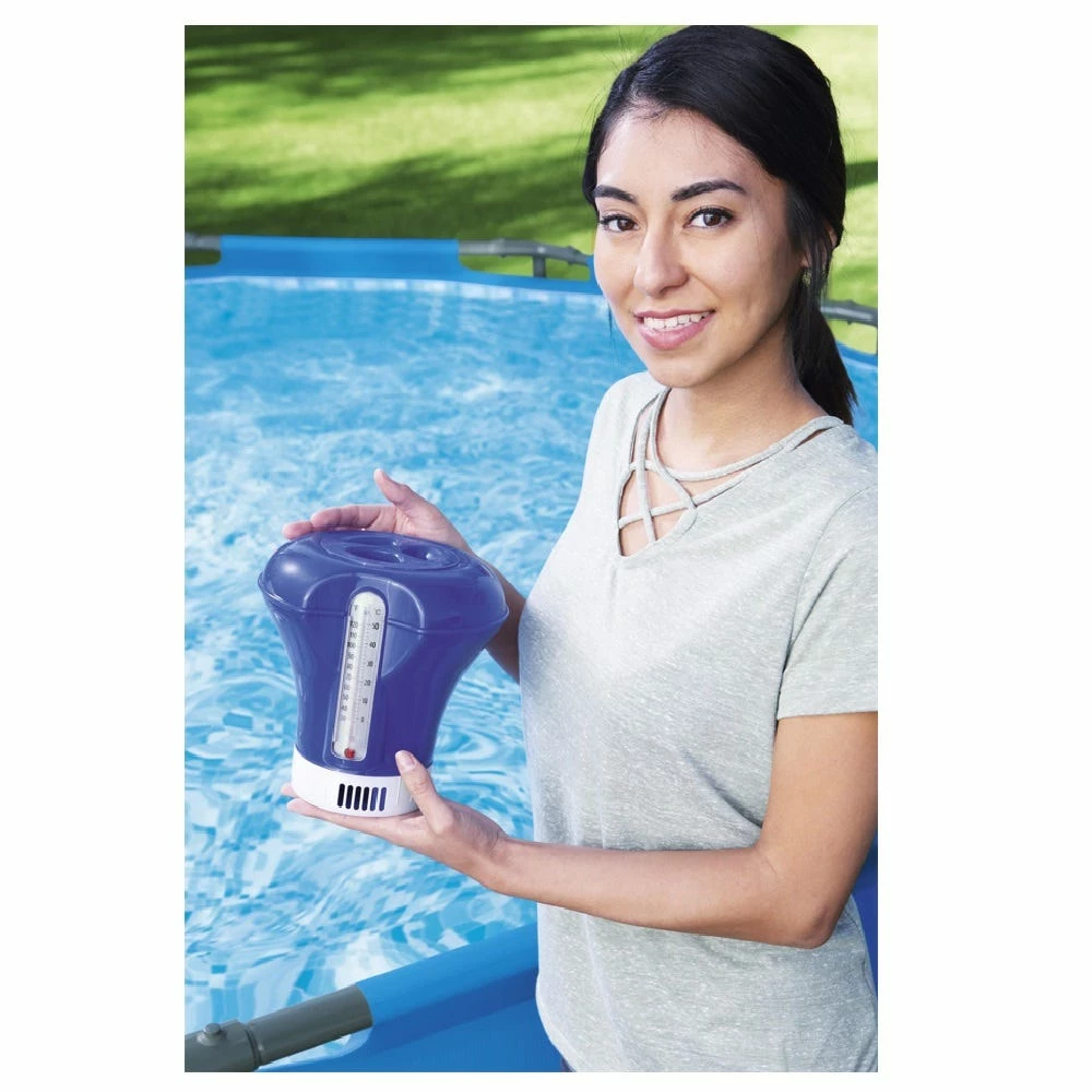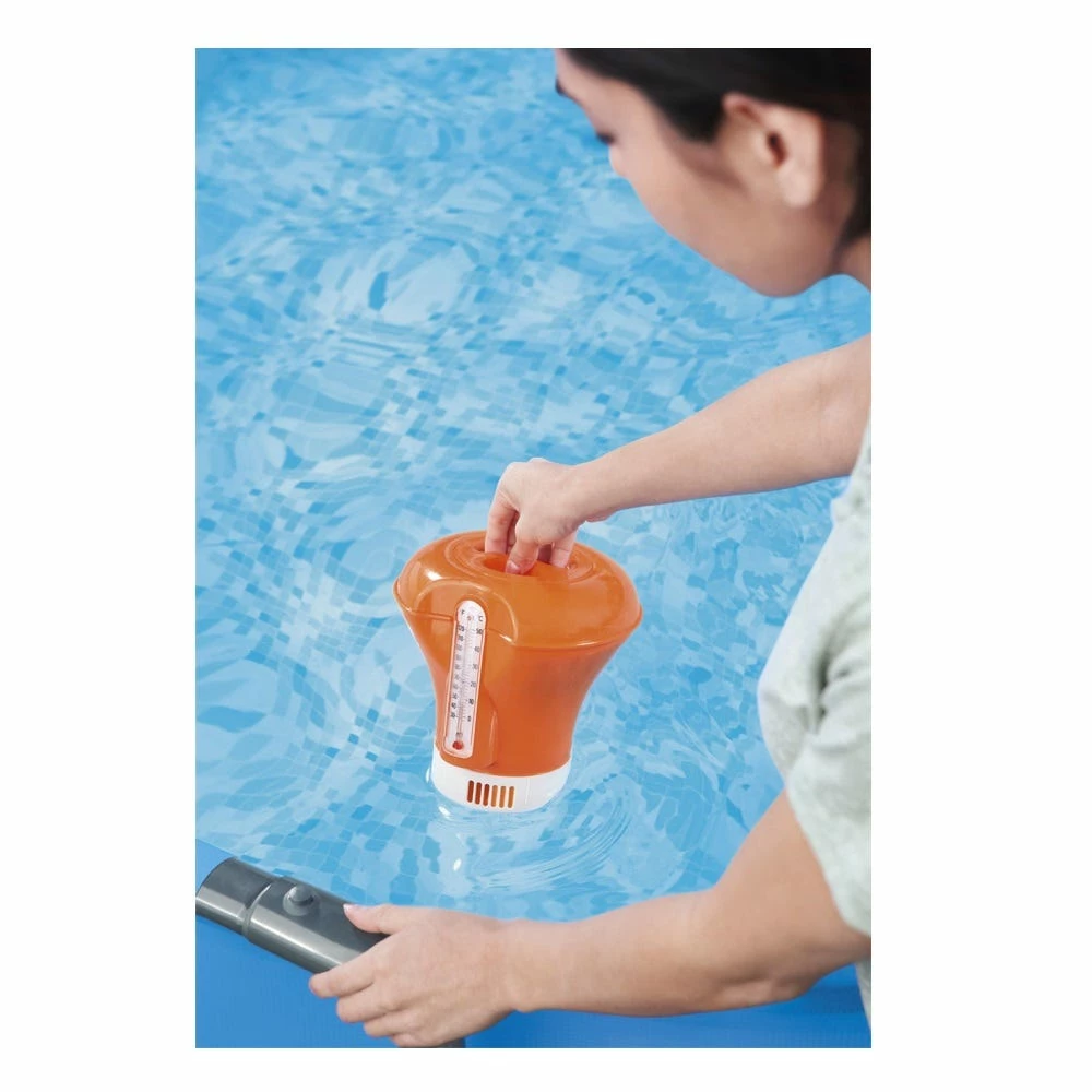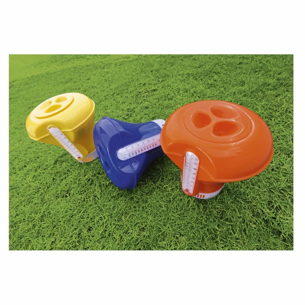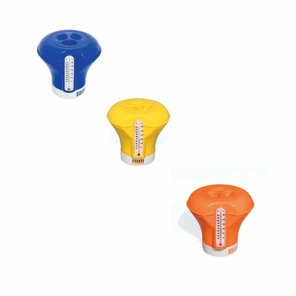 Keep your pool water crystal clear with a Chemical Floater by Bestway®. This floater is available in 3 assorted colors and dispenses 3 in (7.6 cm) chemical tablets. It also has an adjustable dial to control the release of the chemicals. (Tablets not included.) It also has an integrated pool thermometer with an easy to read temperature gauge which displays in both Fahrenheit and Celsius.