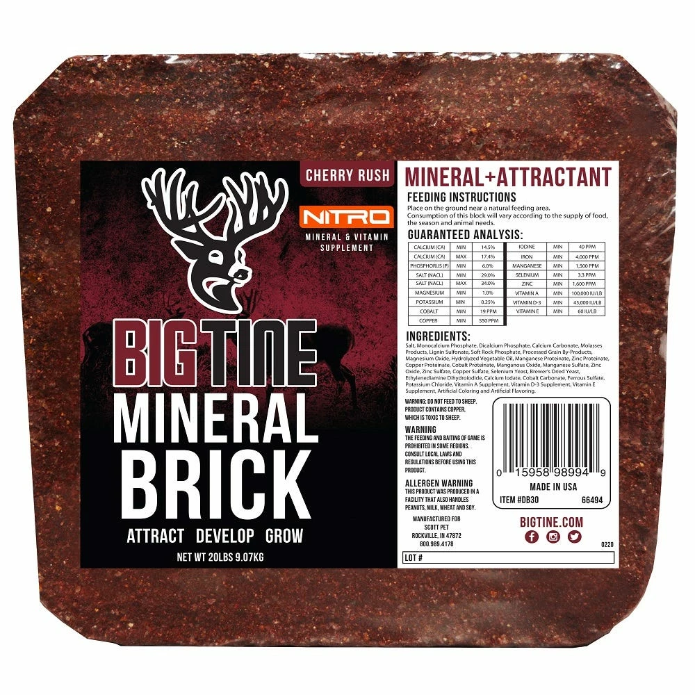 All the great antler building components found in Big Tine’s Nitro Mineral pressed into a convenient and ready to use block. When hunters want to supplement but are faced with issues like not living near their hunting property or simply not having the time to recharge mineral sites regularly, the Nitro Mineral Brick fills that void. Deer are able to consume the block and continue using the site long after the block is gone due to the nutrients that are leached into the soil.