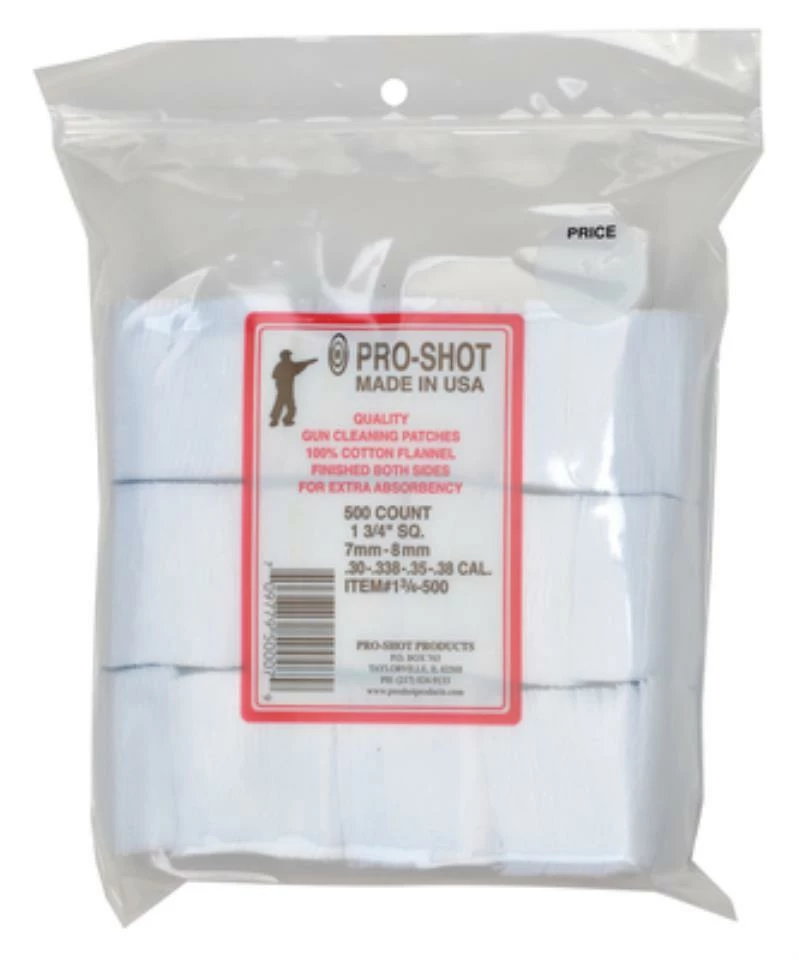 Pro-Shot Square Cleaning Patch .38 Caliber 500Ct 13/4-500 from Pro-Shot the company known for their top notch cleaning equipment. The Cleaning Patch is made from 100% Cotton Flannel which allows the fabric to absorb any residue in the bore.