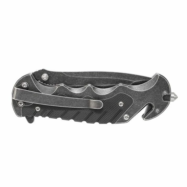 - Knife features a glass break and strap cutter