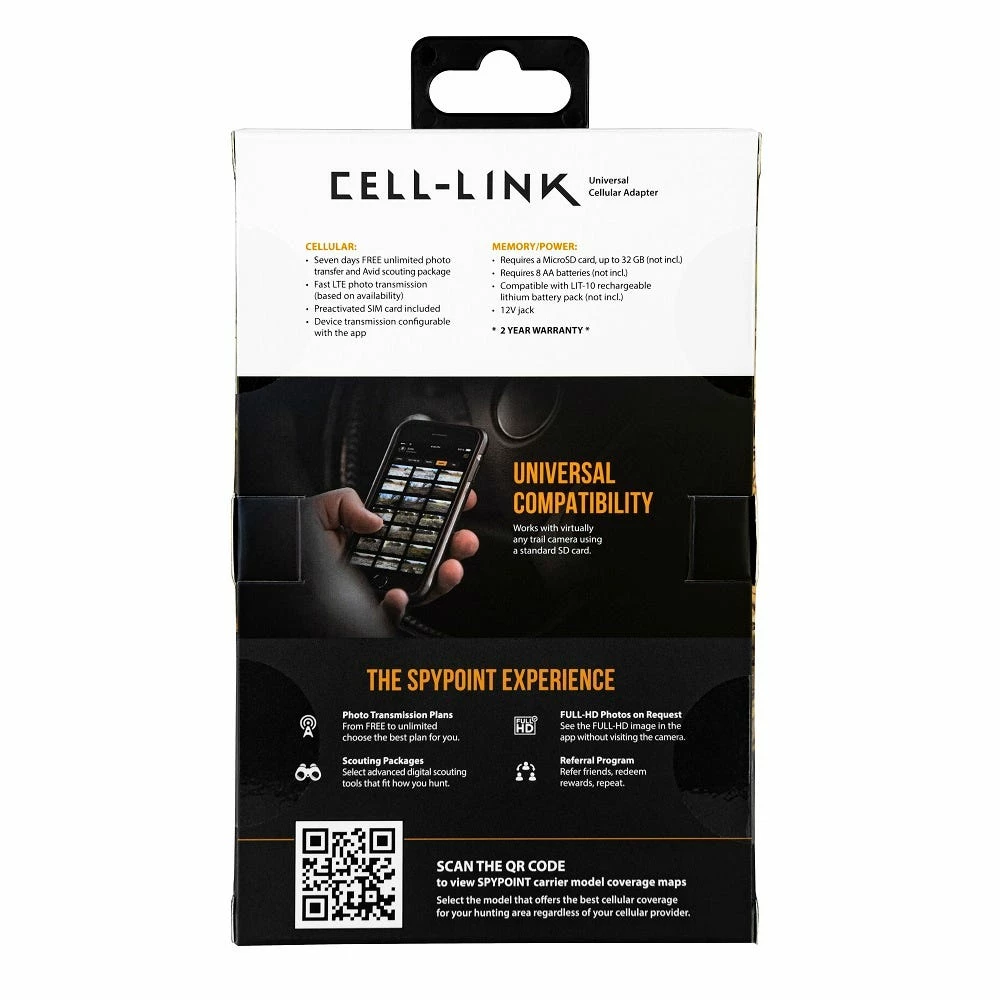 The CELL-LINK takes your scouting to the next level, the cellular level, by turning your current non-cellular camera into a cellular capable device. You no longer have to make trips to pull cards, risking leaving your scent behind, or wait weeks to see what bucks are showing up on camera. Take advantage of the SPYPOINT EXPERIENCE and the advanced digital scouting features that come with it.